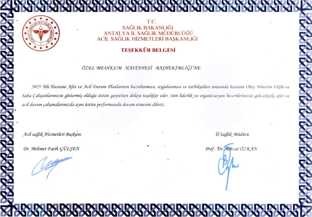 Antalya İl Sağlık Müdürlüğü tarafından, 2025 yılı Hastane Afet ve Acil Durum Planları (HAP) kapsamında yürütülen hazırlık, uygulama ve tatbikat çalışmaları sırasında; hastanemiz Hastane Olay Yönetim Ekibi ve saha çalışanlarımızın göstermiş olduğu üstün gayret, özverili çalışma ve başarılı koordinasyon nedeniyle hastanemize Teşekkür Belgesi takdim edilmiştir.